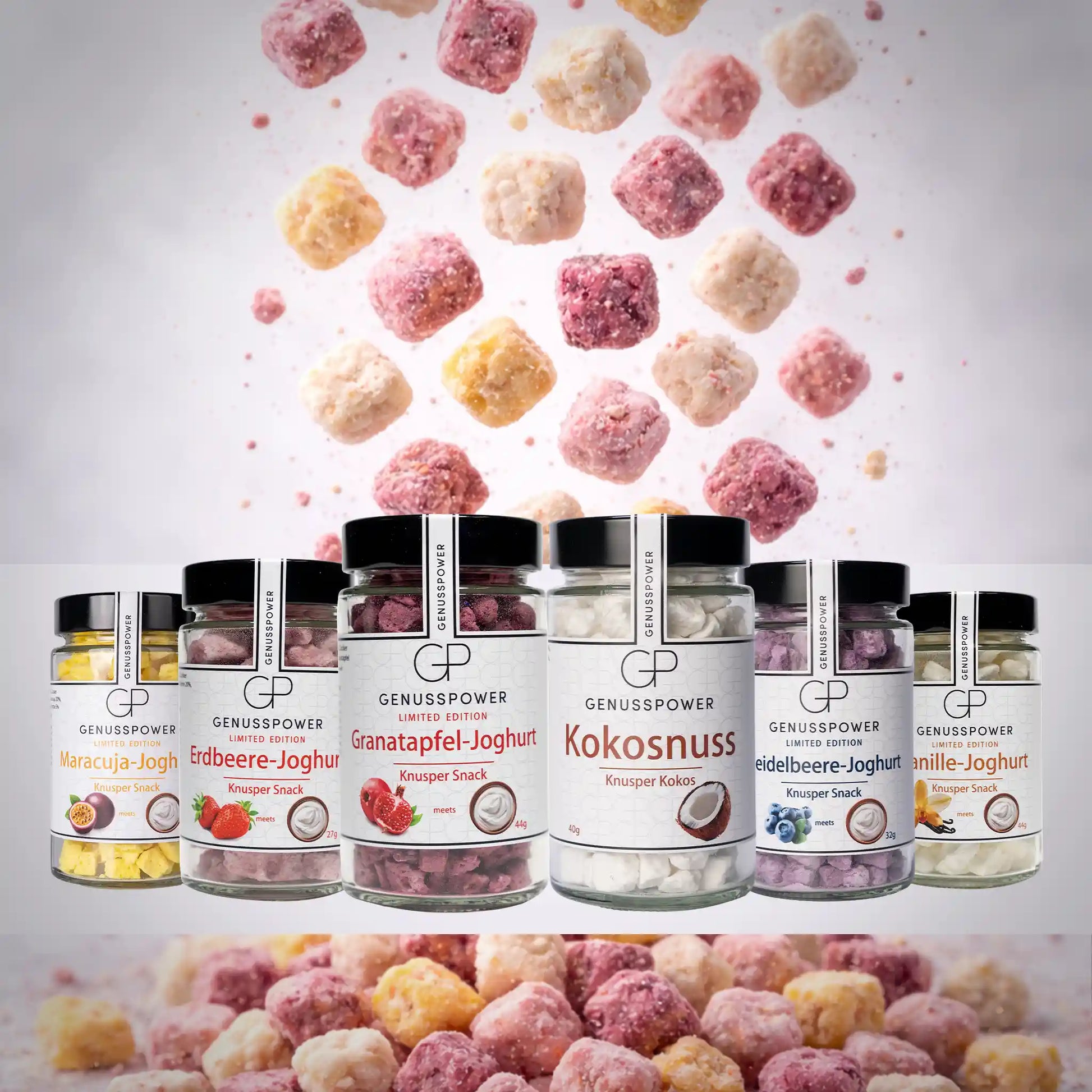 Knusprig, leicht, intensiv im Geschmack – jede Sorte bringt ihren eigenen Moment mit. Fruchtig-frisch, cremig-mild, überraschend anders. Gefriergetrocknete Früchte treffen auf feinen Joghurt und werden zu kleinen Stücken, die mehr sind als nur ein Snack.
